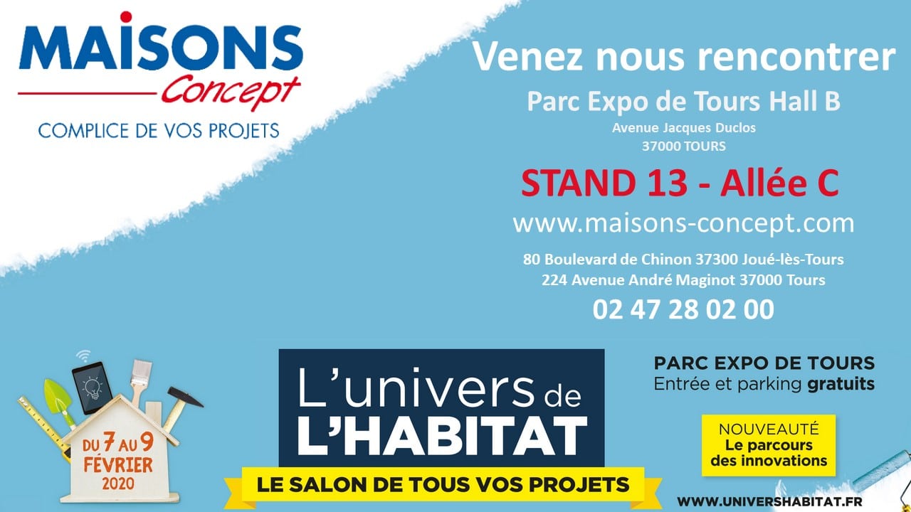 Du 7 au 9 Février 2020 retrouver Maisons Concept à Tours à l’occasion du Salon l’Univers de l’Habitat sur le Stand 13 Allée C.