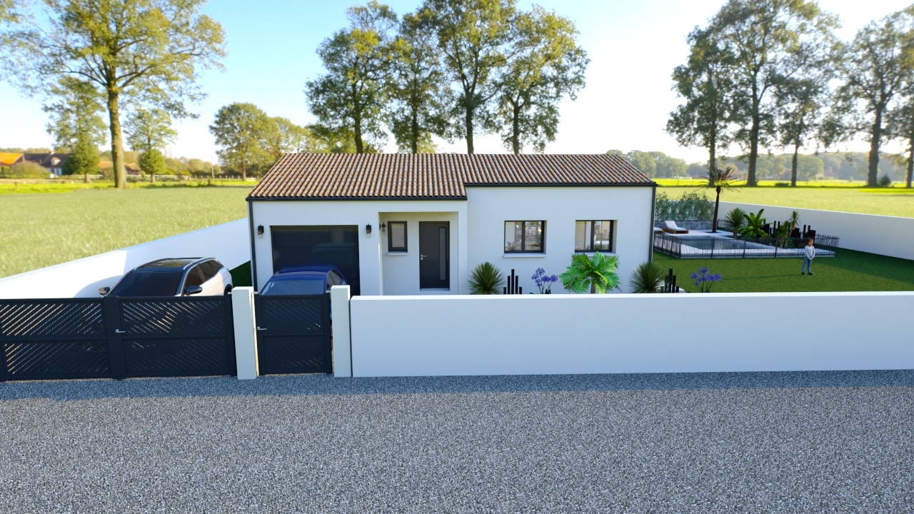 Cette maison avec garage intégré présente un petit porche sur entrée aussi pratique qu’élégant. Son toit en tuiles romaines à deux pans lui sied parfaitement. Le noir des chéneaux et descentes d’eau de pluie, ainsi que les huisseries et la porte d’entrée rehaussent les façades immaculées. Quant au terrain, il paraît conçu pour elle ! Ceint d’un mur blanc protégeant des regards extérieurs, il est prévu pour accueillir une piscine, pour le plus grand bonheur de tous.